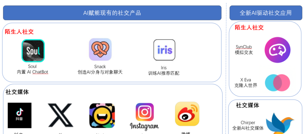 深度体验这类产品一段时间之后,我肯定了AI能够极大地提升社交产品的个性化体验。接下来我会对最近体验的较头部的社交产品AI赋能情况,以及具有代表性的社交产品AI方向进行梳理。我将把这些产品主要以两大类进行介绍,分别是陌生人社交和全新AI驱动的社交应用。
